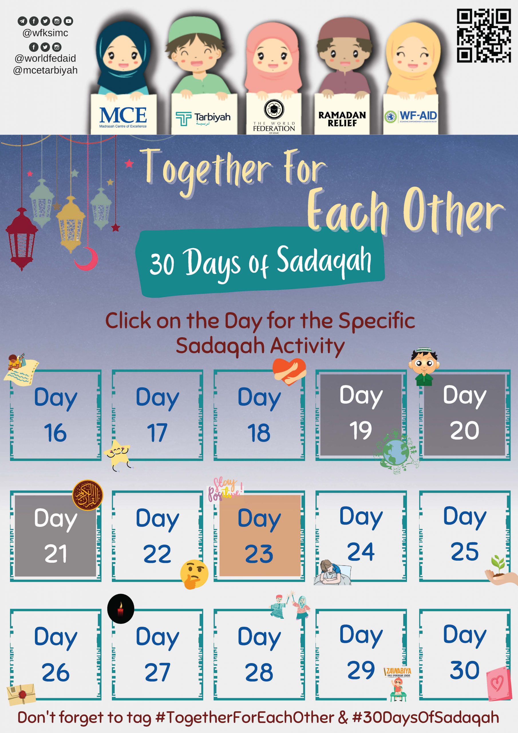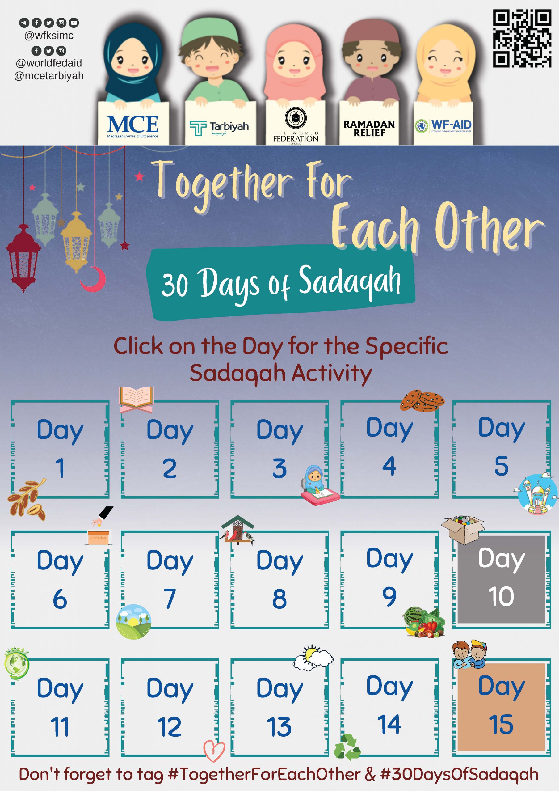 Share pictures and updates of your daily challenges with your family and friends on social media, by using #30daysofsadaqah, #TogetherForEachOther, #WFAID and @MceTarbiyah on Instagram and Facebook.